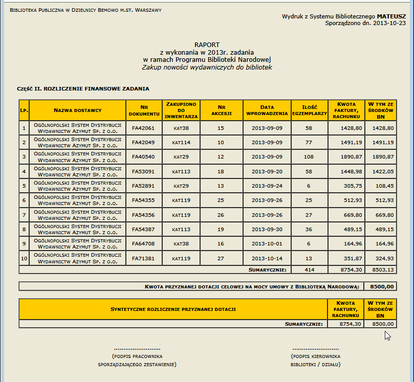 towarzyszących (np. przeprowadzanie skontrum, windykacji, oceny pracowniczej, obsługa czytelni,