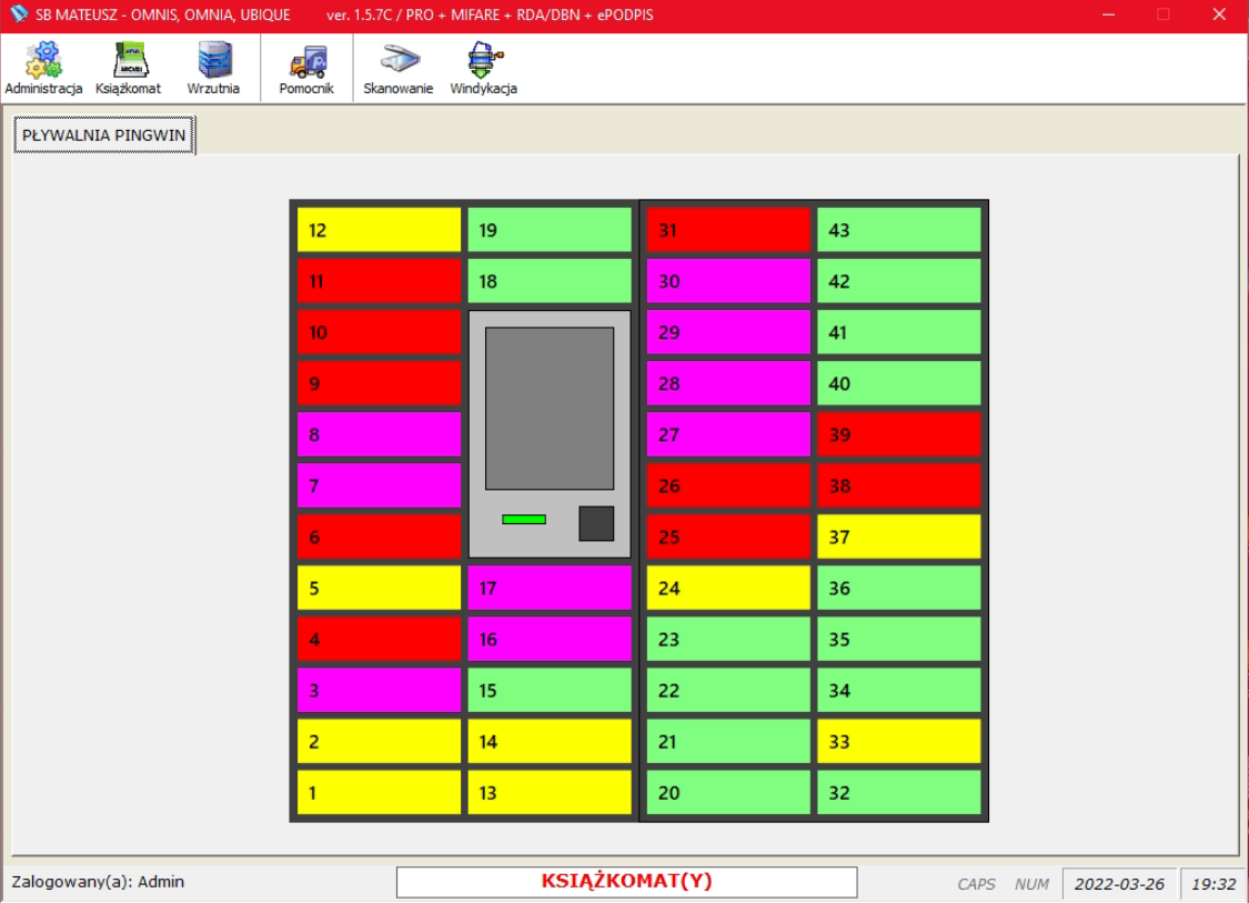 Możliwość rozszerzenia funkcjonalności systemu o protokół SIP2 umożliwia podłączenie / integrację z książkomatami, wrzutniami / sefcheckami. W systemi możemy na bieżąco śledzić stany skrytek wybranego książkomatu.
