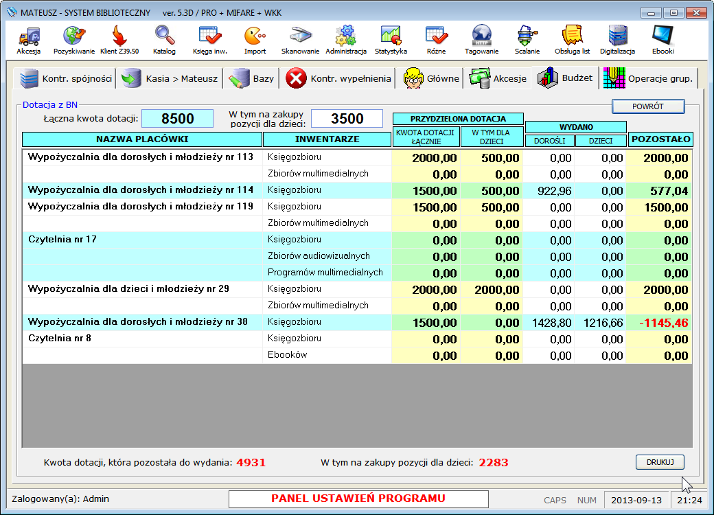 Ilość stacji roboczych (komputerów na których jest zainstalowany MATEUSZ) nie podlega ograniczeniom. Zwiększenie ilości komputerów w placówce z np. 1 do 1000 nie wymaga uiszczania ŻADNYCH OPŁAT!